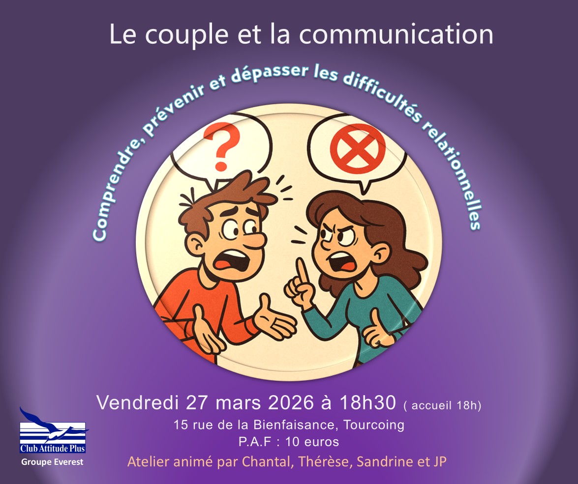 Cet atelier a pour objectif de réfléchir ensemble à : ce qu’est le couple, à ce qui le fonde, aux difficultés de communication les plus fréquentes et aux moyens de les dépasser pour construire une relation plus épanouissante.